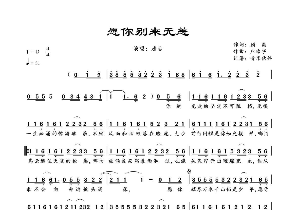 《愿你别来无恙》是唐古演唱的一首歌曲,拍号为4/4拍,歌曲速度为每分钟51拍,这份简谱共有一张高清图谱,图谱由 @音乐伙伴 编配上传。