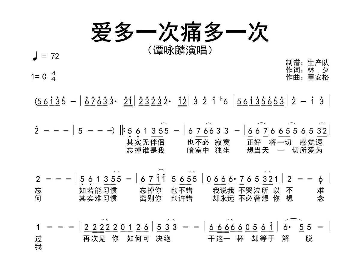 《爱多一次痛多一次》是谭咏麟演唱的一首歌曲,原版简谱,拍号为4/4拍,歌曲速度为每分钟72拍,这份简谱共有一张高清图谱,图谱由 @生产队 编配上传谭咏麟演唱的歌曲《爱多一次痛多一次》原版简谱,包含完整的前奏、间奏solo编配!。