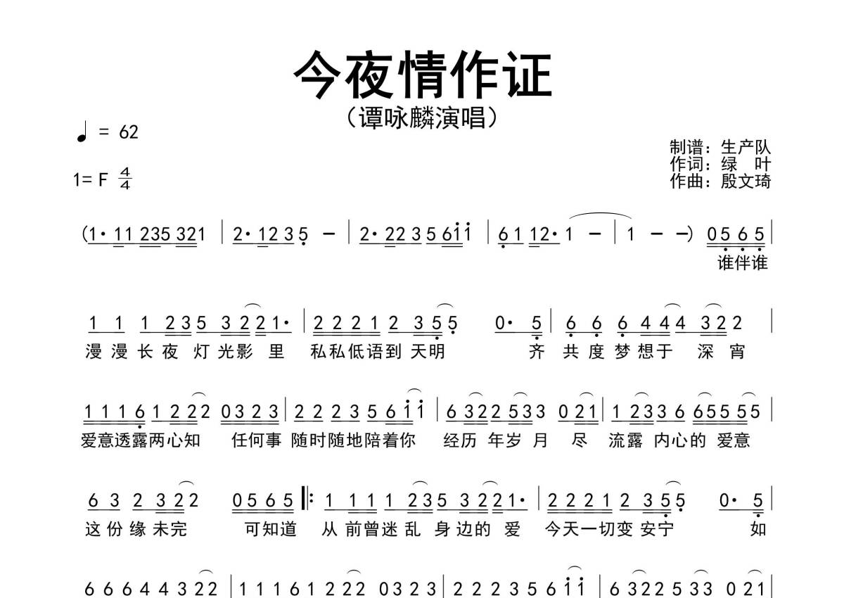 《今夜情作证》是谭咏麟演唱的一首歌曲,原版简谱,拍号为4/4拍,歌曲速度为每分钟62拍,这份简谱共有一张高清图谱,图谱由 @生产队 编配上传谭咏麟演唱的歌曲《今夜情作证》原版简谱。