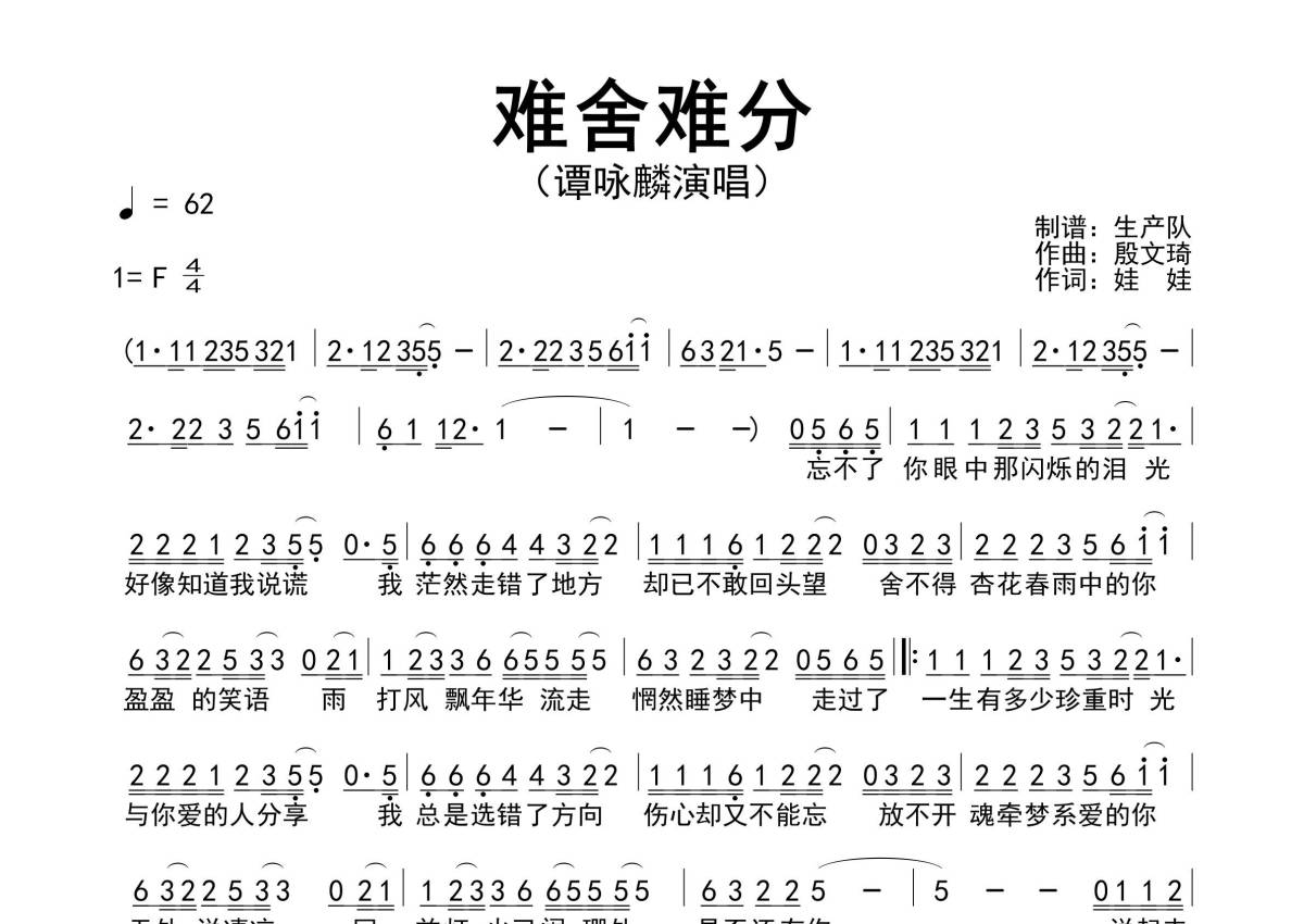 《难舍难分》是谭咏麟演唱的一首歌曲,原版简谱,拍号为4/4拍,歌曲速度为每分钟62拍,这份简谱共有一张高清图谱,图谱由 @生产队 编配上传谭咏麟演唱的歌曲《难舍难分》原版简谱,包含完整的前奏、间奏、尾奏solo编配!。