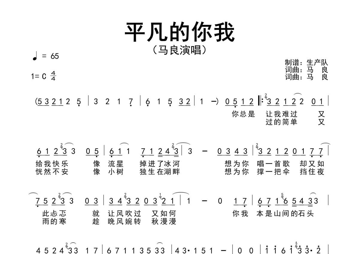 《平凡的你我》是马良演唱的一首歌曲,原版简谱,拍号为4/4拍,歌曲速度为每分钟65拍,这份简谱共有一张高清图谱,图谱由 @生产队 编配上传马良演唱的歌曲《平凡的你我》原版简谱。