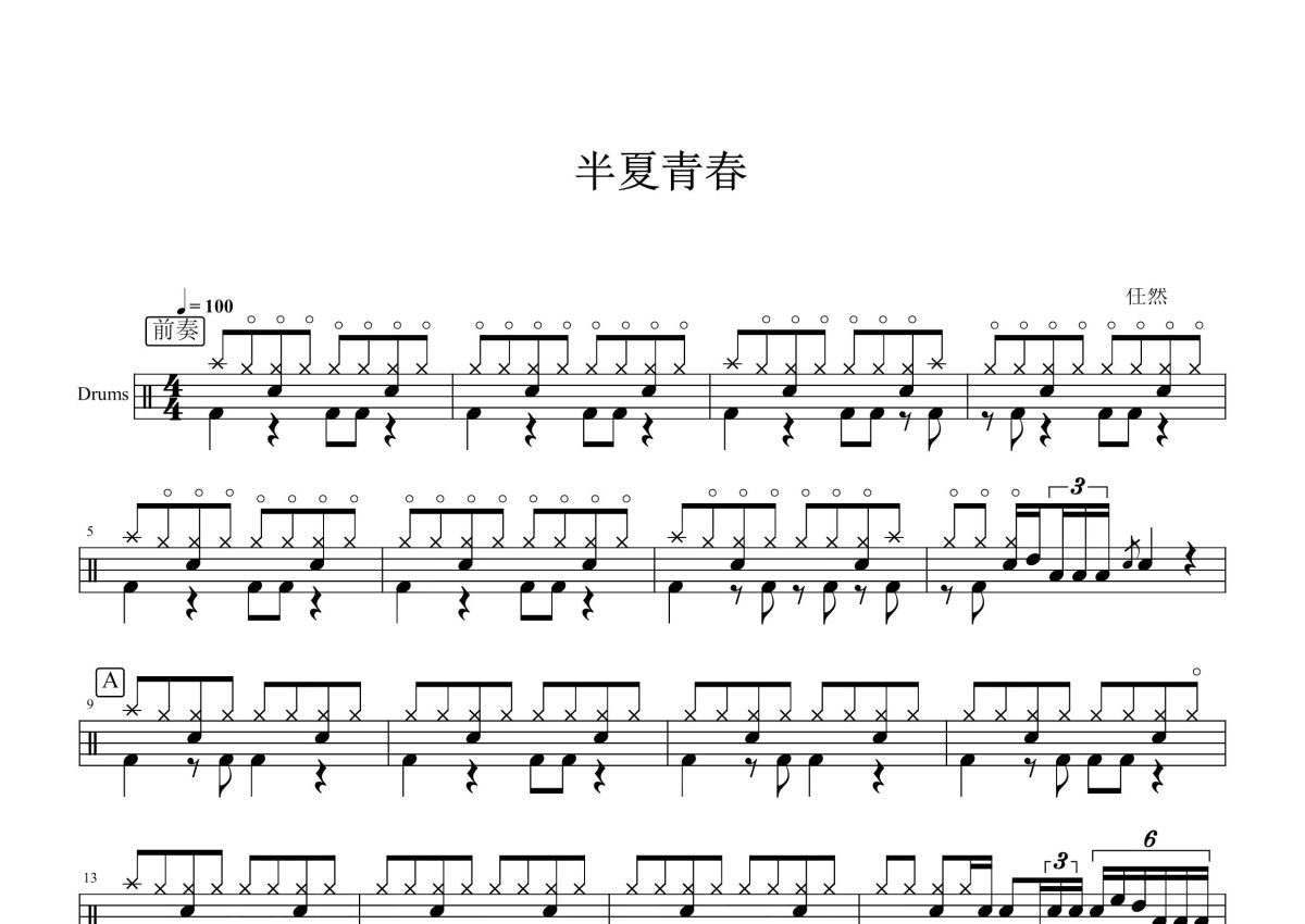 任然《半夏青春》鼓谱 - 架子鼓谱