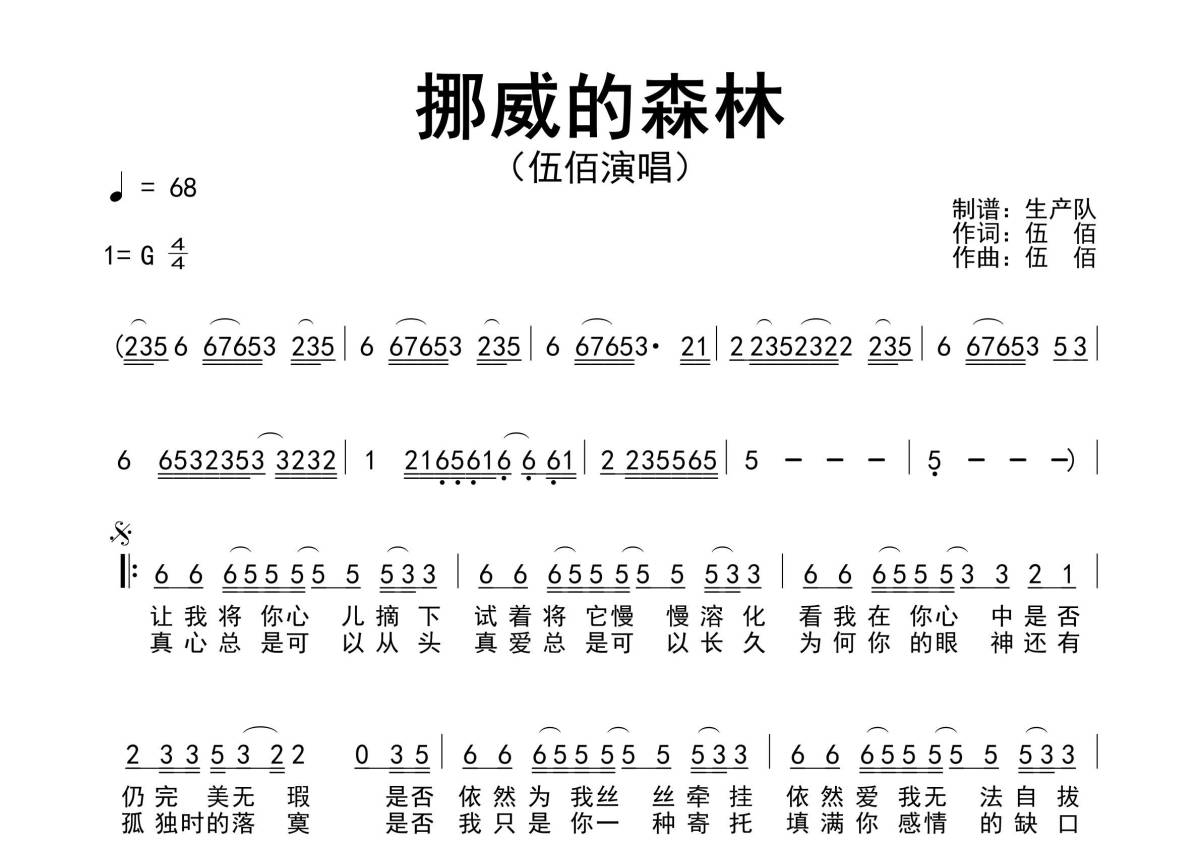 《挪威的森林》是伍佰演唱的一首歌曲,原版简谱,拍号为4/4拍,歌曲速度为每分钟68拍,这份简谱共有两张高清图谱,图谱由 @生产队 编配上传伍佰演唱的歌曲《挪威的森林》原版简谱。