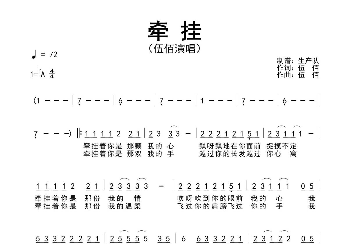 《牵挂》是伍佰演唱的一首歌曲,原版简谱,拍号为4/4拍,歌曲速度为每分钟72拍,这份简谱共有两张高清图谱,图谱由 @生产队 编配上传伍佰演唱的歌曲《牵挂》原版简谱。