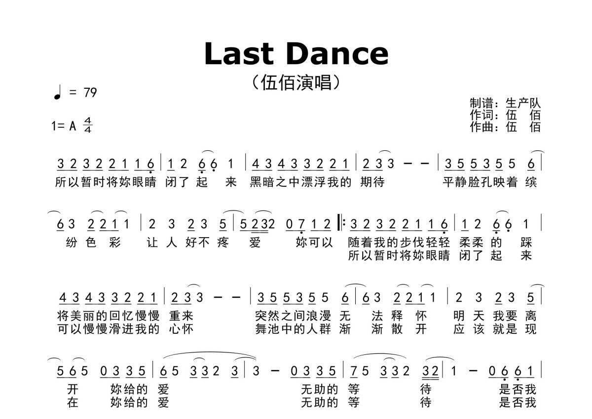 《Last Dance》是伍佰演唱的一首歌曲,原版简谱,拍号为4/4拍,歌曲速度为每分钟79拍,这份简谱共有一张高清图谱,图谱由 @生产队 编配上传伍佰演唱的歌曲《Last Dance》原版简谱。
