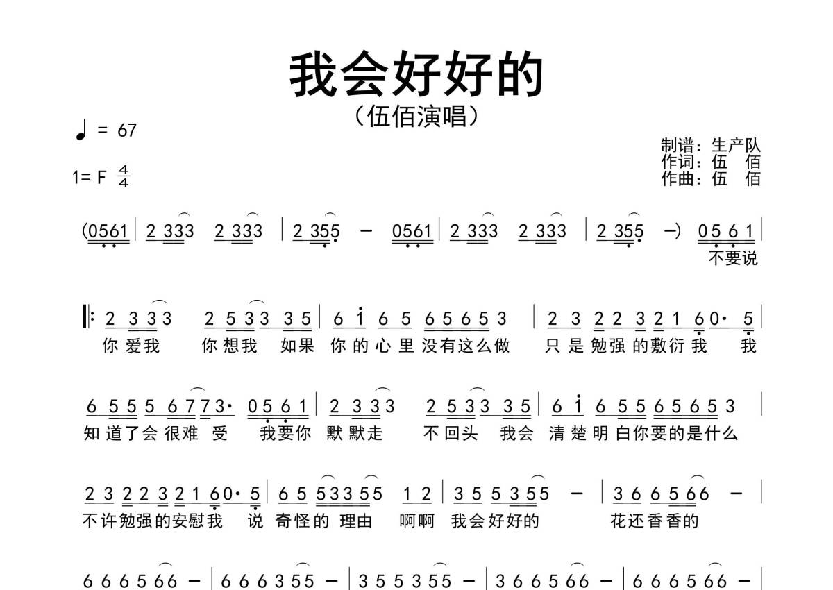 《我会好好的》是伍佰演唱的一首歌曲,原版简谱,拍号为4/4拍,歌曲速度为每分钟67拍,这份简谱共有一张高清图谱,图谱由 @生产队 编配上传伍佰演唱的歌曲《我会好好的》原版简谱。
