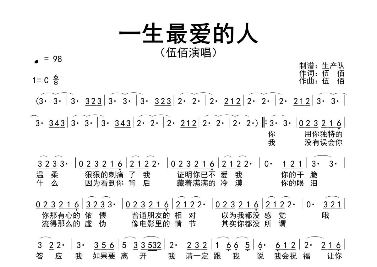 《一生最爱的人》是伍佰演唱的一首歌曲,原版简谱,拍号为6/8拍,歌曲速度为每分钟98拍,这份简谱共有一张高清图谱,图谱由 @生产队 编配上传伍佰演唱的歌曲《一生最爱的人》原版简谱。