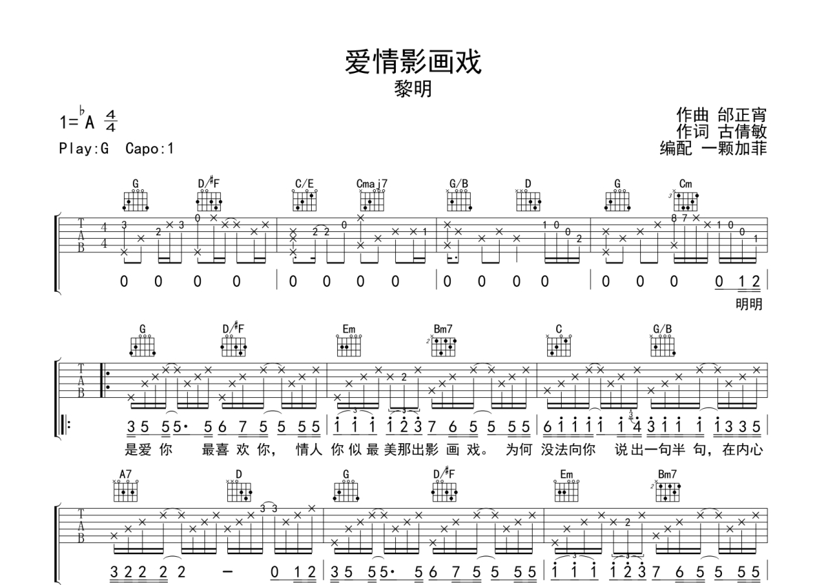 黎明《爱情影画戏》吉他谱 - G调弹唱六线谱