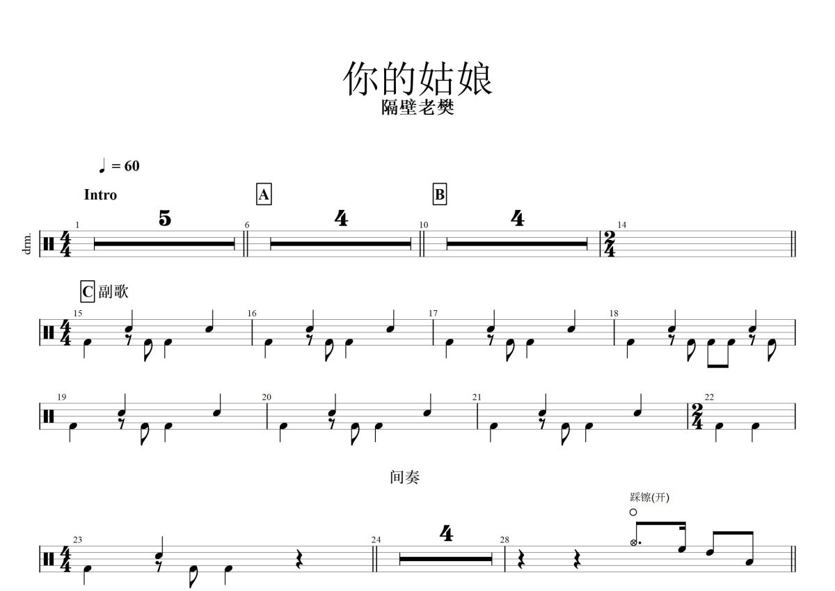 隔壁老樊《你的姑娘》鼓谱 - 架子鼓谱