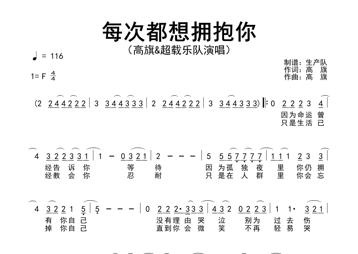 《每次都想拥抱你》是超载乐队/高旗演唱的一首歌曲,拍号为4/4拍,歌曲速度为每分钟116拍,这份简谱共有两张高清图谱,图谱由 @生产队 编配上传高旗&超载乐队演唱的歌曲《每次都想拥抱你》简谱。