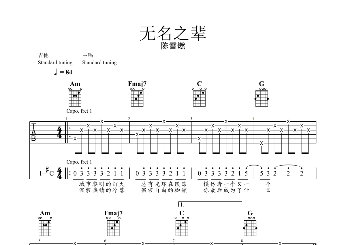 《无名之辈》是陈雪燃演唱的一首歌曲,拍号为4/4拍,歌曲速度为每分钟84拍,歌曲原调为Db调,但由于原调指法比较难,为了方便弹奏,本吉他谱采用的是C调指法编配,变调夹1品弹奏即为原调,当然也可以根据自己的音域改变变调夹位置,或者通过改变和弦调性,以方便自己弹奏,这份吉他谱共有两张高清图谱,图谱由 @牛棚音乐 编配上传,图谱使用六线谱编配,包含吉他和弦指法、简谱以及歌词部分,曲谱配备了相关的音频提供试听,使用这份无名之辈吉他谱,可以让你更加方便地掌握这首歌曲的弹唱技巧,快来尝试吧。陈雪燃演唱的《无名之辈》,原点升C调,C调指法编配,变调夹1品,简单,适合初学者,附件含有PDF高清无水印曲谱。