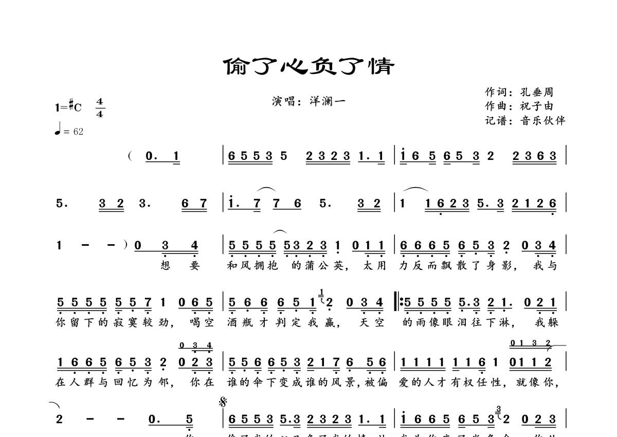 《偷了心负了情》是洋澜一演唱的一首歌曲,拍号为4/4拍,歌曲速度为每分钟62拍,这份简谱共有一张高清图谱,图谱由 @音乐伙伴 编配上传。