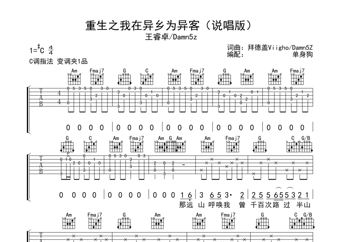 王睿卓/Damn5z《重生之我在异乡为异客》吉他谱 - C调说唱版弹唱六线谱