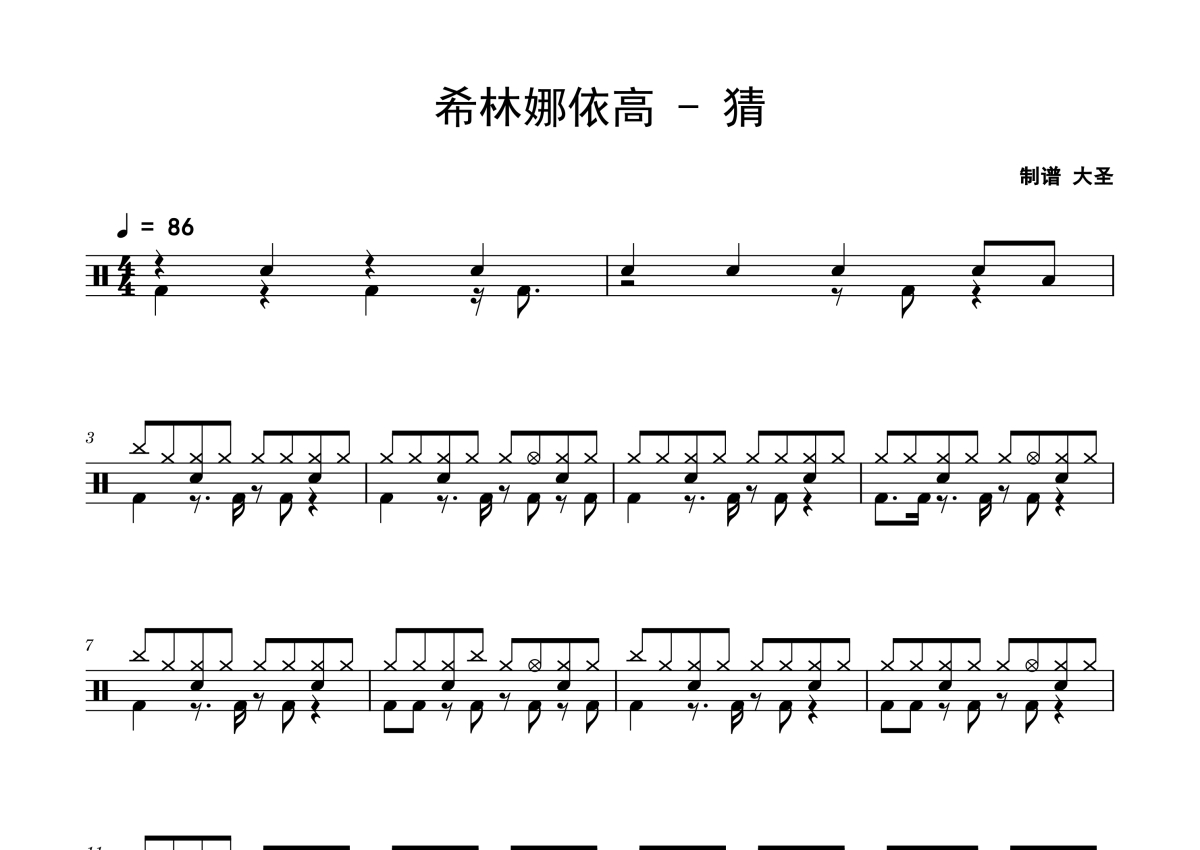 《猜》是希林娜依高演唱的一首歌曲,拍号为4/4拍,歌曲速度为每分钟86拍,这份架子鼓谱共有三张高清图谱,图谱由 @Sawubona 编配上传,图谱使用五线谱编配,使用这份猜架子鼓谱,你将能够轻松地敲打出这首希林娜依高的猜,快来尝试吧。