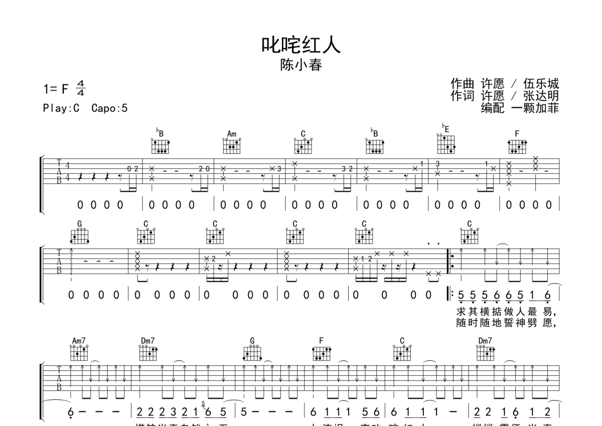 《叱咤红人》是陈小春演唱的一首歌曲,拍号为4/4拍,歌曲原调为F调,但由于原调指法比较难,为了方便弹奏,本吉他谱采用的是C调指法编配,变调夹5品弹奏即为原调,当然也可以根据自己的音域改变变调夹位置,或者通过改变和弦调性,以方便自己弹奏,这份吉他谱共有两张高清图谱,图谱由 @一颗加菲 编配上传,图谱使用六线谱编配,包含吉他和弦指法、简谱以及歌词部分,曲谱配备了相关的音频提供试听,使用这份叱咤红人吉他谱,可以让你更加方便地掌握这首歌曲的弹唱技巧,快来尝试吧。