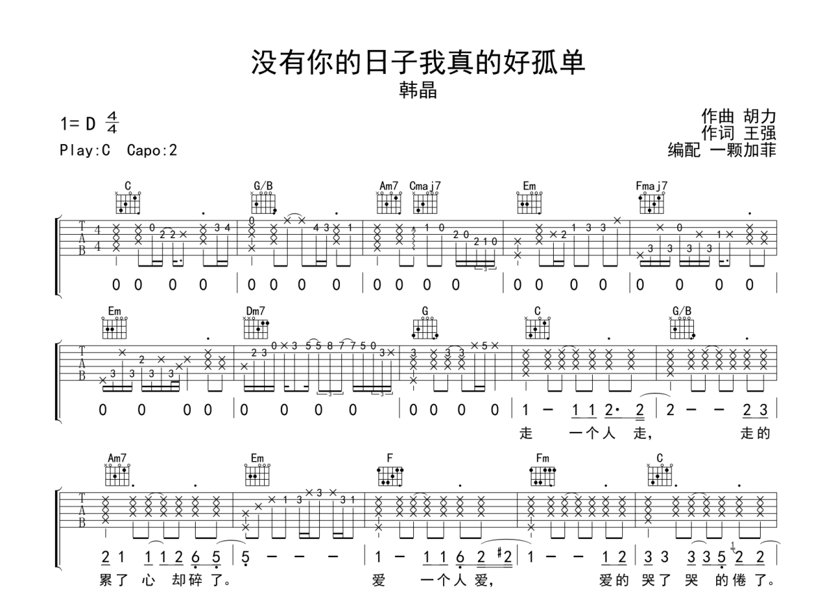 《没有你的日子我真的好孤单》是韩晶演唱的一首歌曲,拍号为4/4拍,歌曲原调为D调,但由于原调指法比较难,为了方便弹奏,本吉他谱采用的是C调指法编配,变调夹2品弹奏即为原调,当然也可以根据自己的音域改变变调夹位置,或者通过改变和弦调性,以方便自己弹奏,这份吉他谱共有两张高清图谱,图谱由 @一颗加菲 编配上传,图谱使用六线谱编配,包含吉他和弦指法、简谱以及歌词部分,曲谱配备了相关的音频提供试听,使用这份没有你的日子我真的好孤单吉他谱,可以让你更加方便地掌握这首歌曲的弹唱技巧,快来尝试吧。