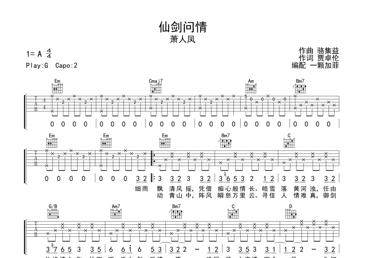 萧人凤《仙剑问情》吉他谱 - G调弹唱六线谱
