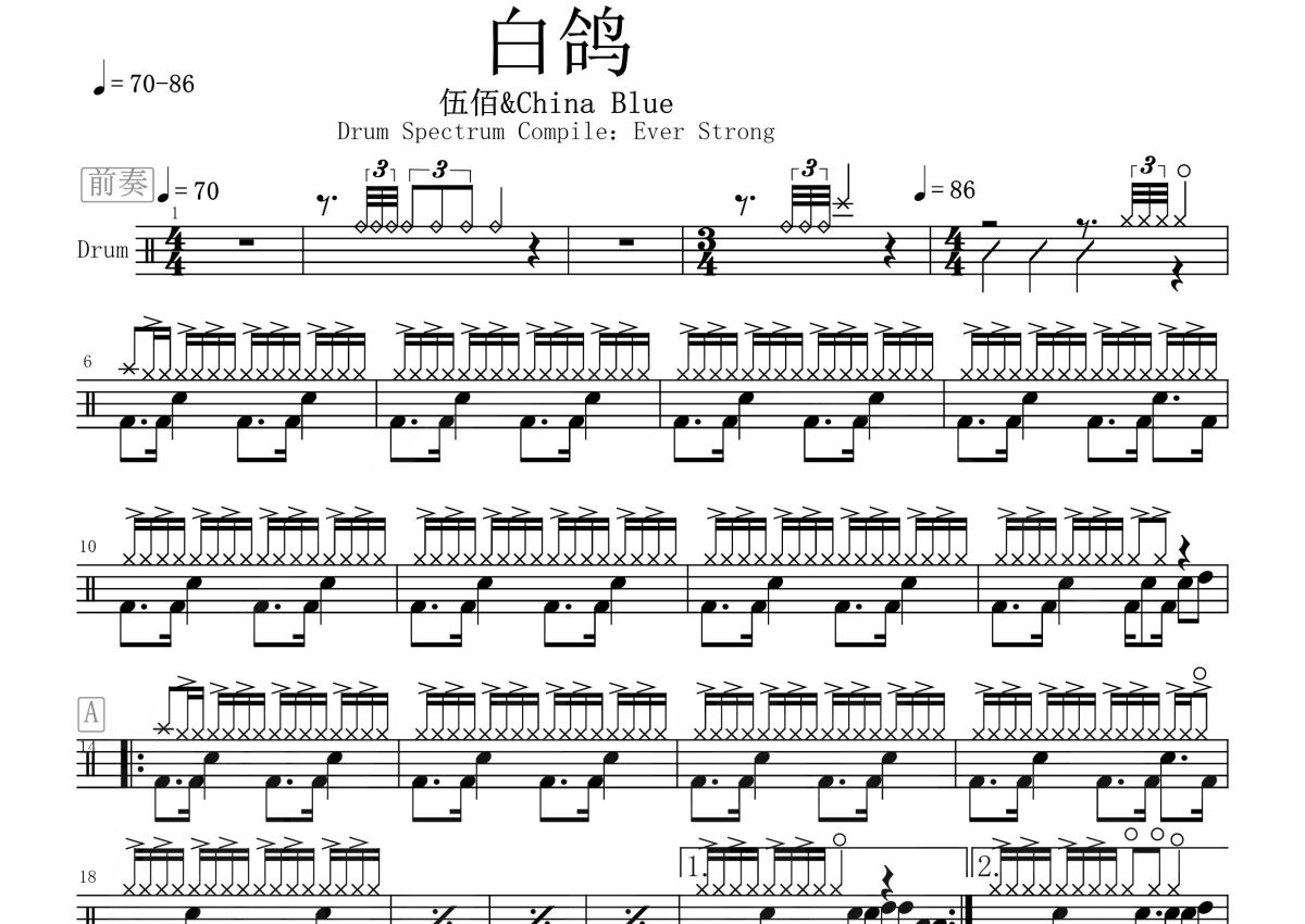 伍佰&China Blue《白鸽》鼓谱 - 架子鼓谱