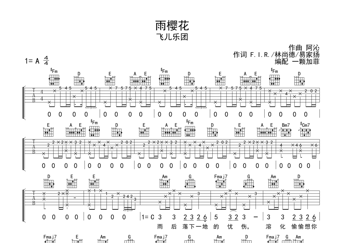 飞儿乐团《雨樱花》吉他谱 - A调弹唱六线谱
