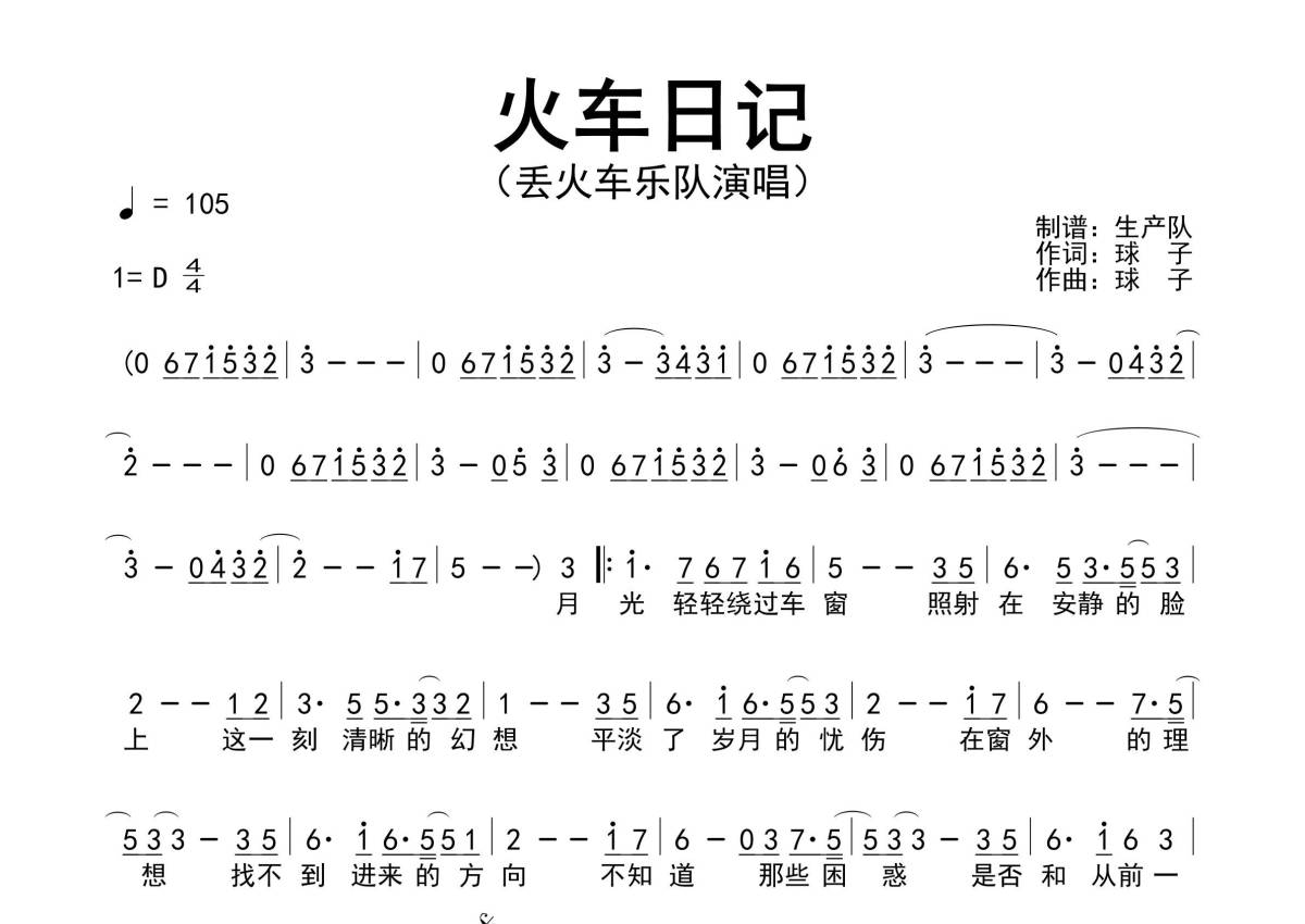 《火车日记》是丢火车乐队演唱的一首歌曲,原版简谱,拍号为4/4拍,歌曲速度为每分钟105拍,这份简谱共有一张高清图谱,图谱由 @生产队 编配上传丢火车乐队演唱的歌曲《火车日记》原版简谱,完整的前奏、间奏和SOLO编配。