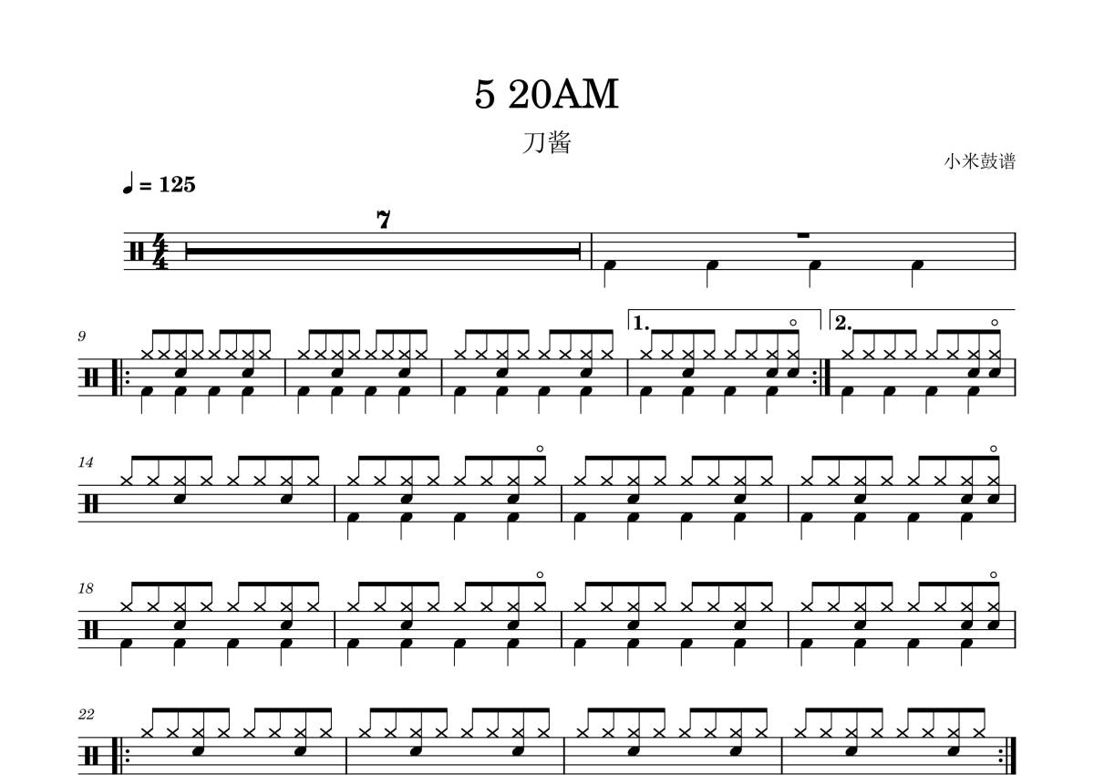 《5 20AM》是刀酱演唱的一首歌曲,拍号为4/4拍,歌曲速度为每分钟125拍,这份架子鼓谱共有两张高清图谱,图谱由 @小米鼓谱 编配上传,图谱使用五线谱编配,使用这份5 20AM架子鼓谱,你将能够轻松地敲打出这首刀酱的5 20AM,快来尝试吧。