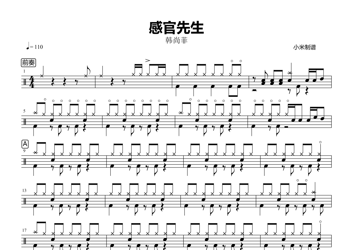 《感官先生》是韩尚菲演唱的一首歌曲,拍号为4/4拍,歌曲速度为每分钟110拍,这份架子鼓谱共有三张高清图谱,图谱由 @小米鼓谱 编配上传,图谱使用五线谱编配,使用这份感官先生架子鼓谱,你将能够轻松地敲打出这首韩尚菲的感官先生,快来尝试吧。