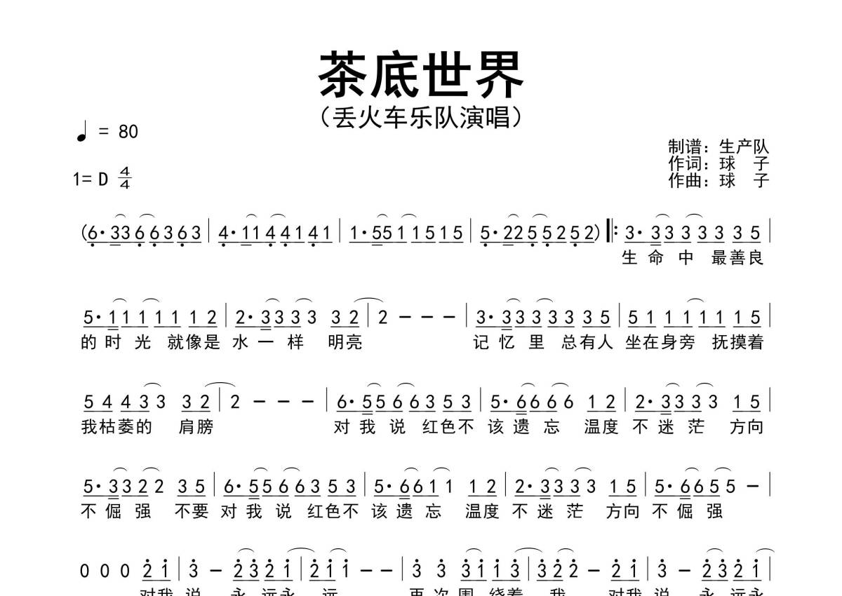 《茶底世界》是丢火车乐队演唱的一首歌曲,原版简谱,拍号为4/4拍,歌曲速度为每分钟80拍,这份简谱共有一张高清图谱,图谱由 @生产队 编配上传丢火车乐队演唱的歌曲《茶底世界》原版简谱,完整的前奏、间奏和SOLO编配。
