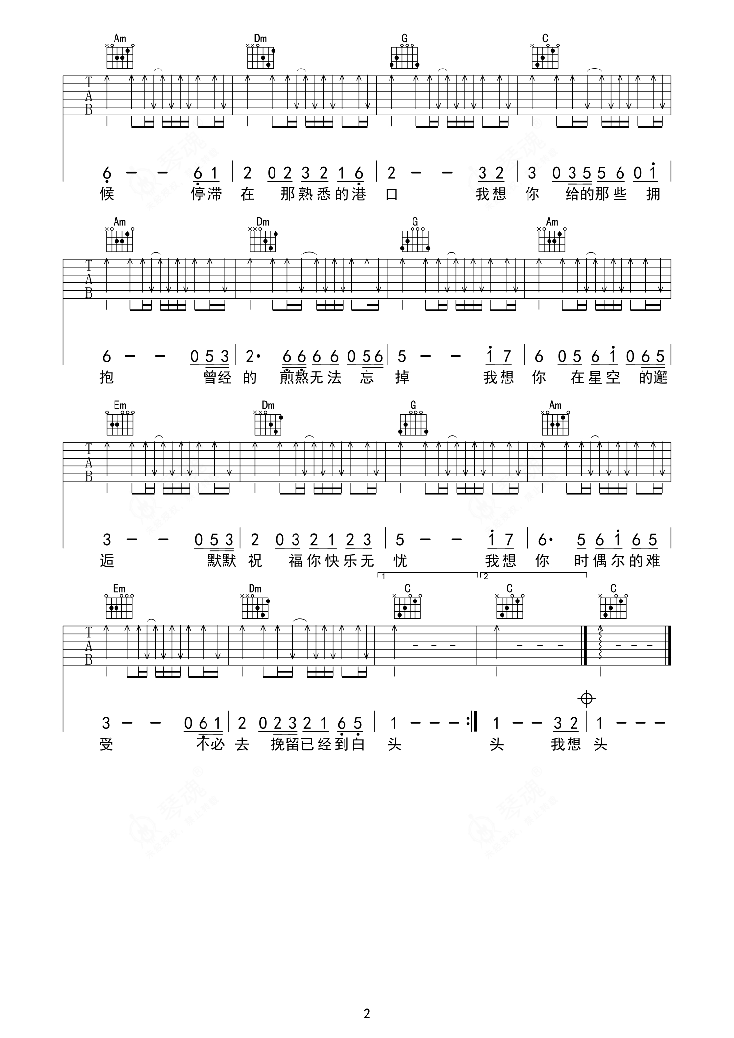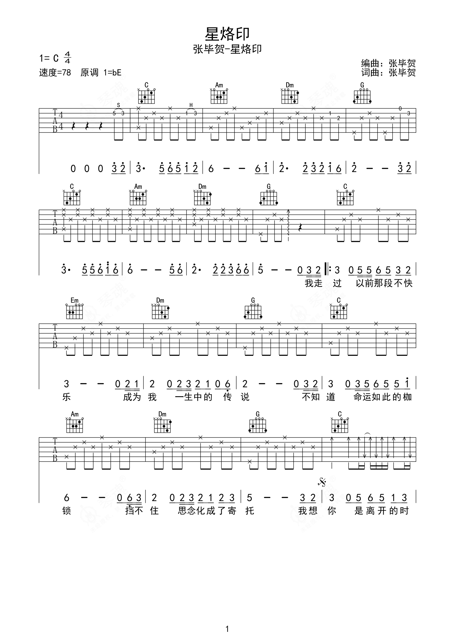 张毕贺《星烙印》吉他谱 - C调弹唱六线谱 - 弹唱版