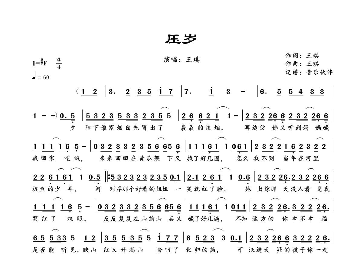 《压岁》是王琪演唱的一首歌曲,拍号为4/4拍,歌曲速度为每分钟60拍,这份简谱共有一张高清图谱,图谱由 @音乐伙伴 编配上传。