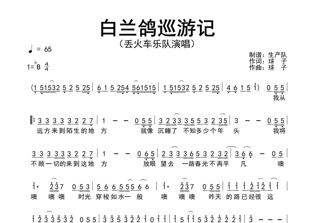 《白兰鸽巡游记》是丢火车乐队演唱的一首歌曲,原版简谱,拍号为4/4拍,歌曲速度为每分钟65拍,这份简谱共有一张高清图谱,图谱由 @生产队 编配上传丢火车乐队演唱的歌曲《白兰鸽巡游记》原版简谱,完整的前奏、间奏和SOLO编配。