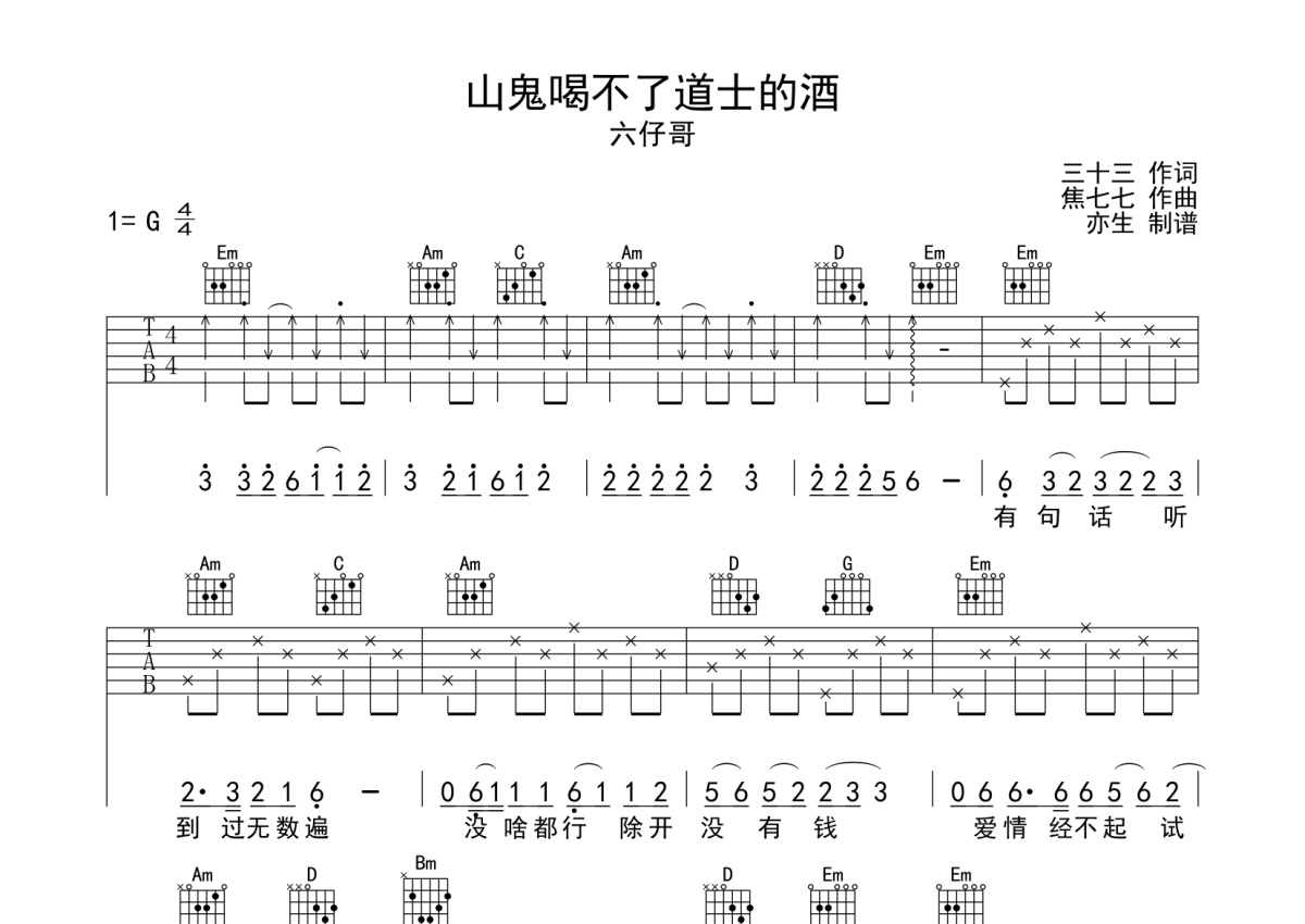 六仔哥《山鬼喝不了道士的酒》吉他谱 - G调弹唱六线谱
