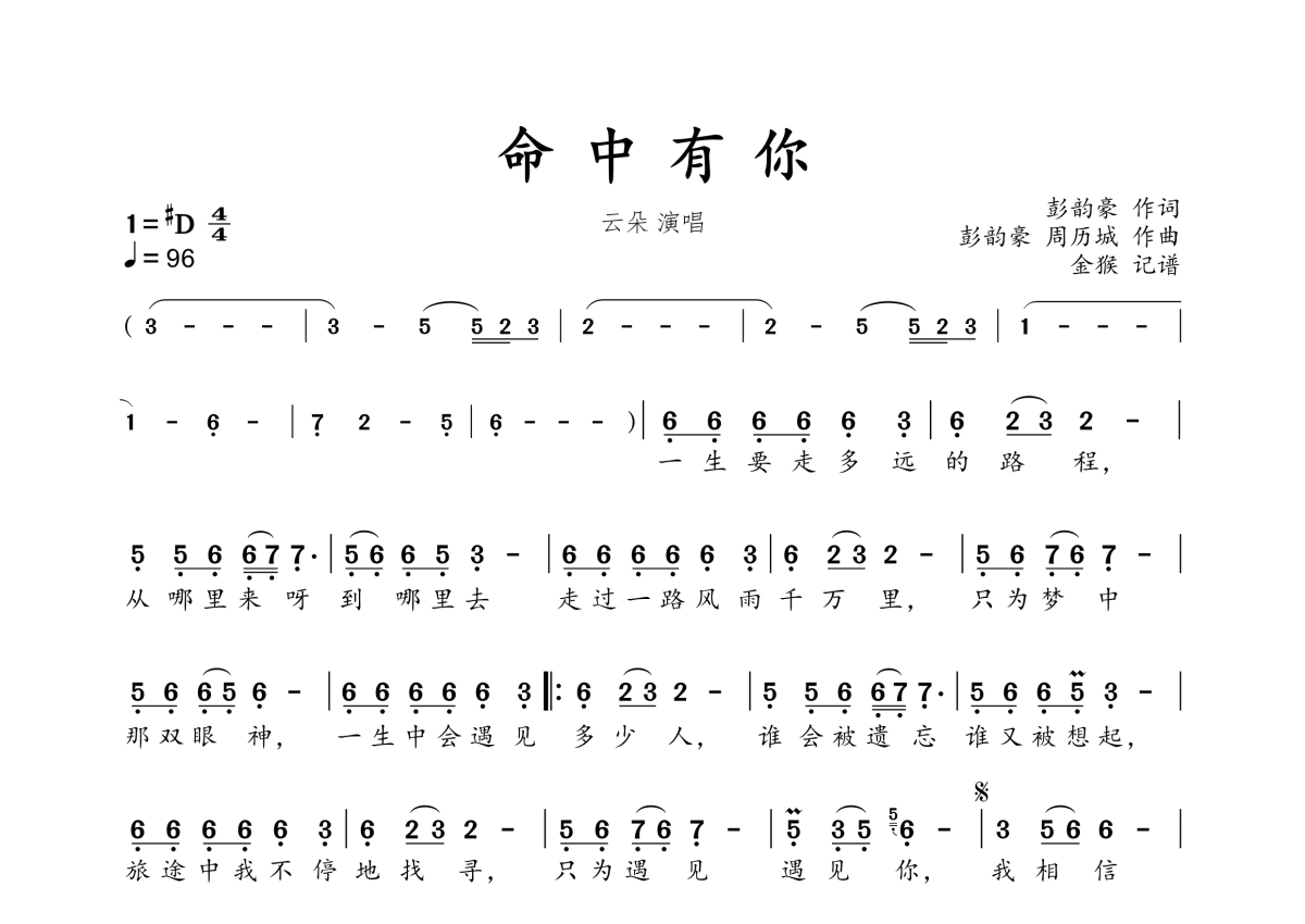 《命中有你》是云朵演唱的一首歌曲,拍号为4/4拍,歌曲速度为每分钟96拍,这份简谱共有一张高清图谱,图谱由 @金猴奋起千钧棒 编配上传。
