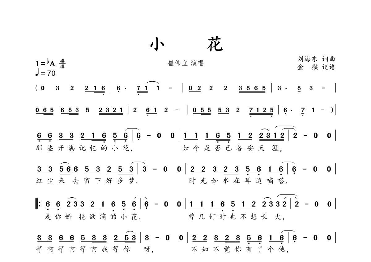 《小花》是崔伟立演唱的一首歌曲,拍号为4/4拍,歌曲速度为每分钟70拍,这份简谱共有一张高清图谱,图谱由 @金猴奋起千钧棒 编配上传。