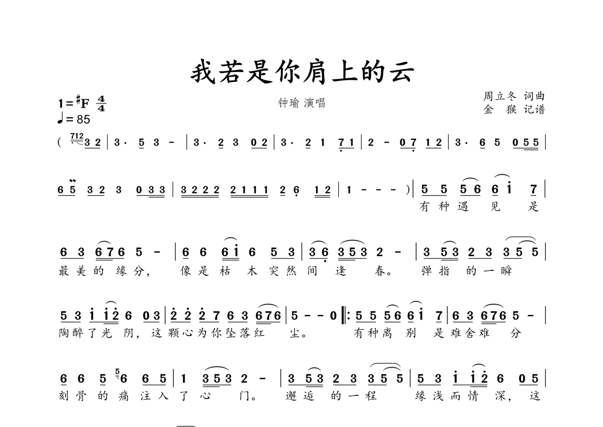 《我若是你肩上的云》是仲瑜演唱的一首歌曲,拍号为4/4拍,歌曲速度为每分钟85拍,这份简谱共有一张高清图谱,图谱由 @金猴奋起千钧棒 编配上传。