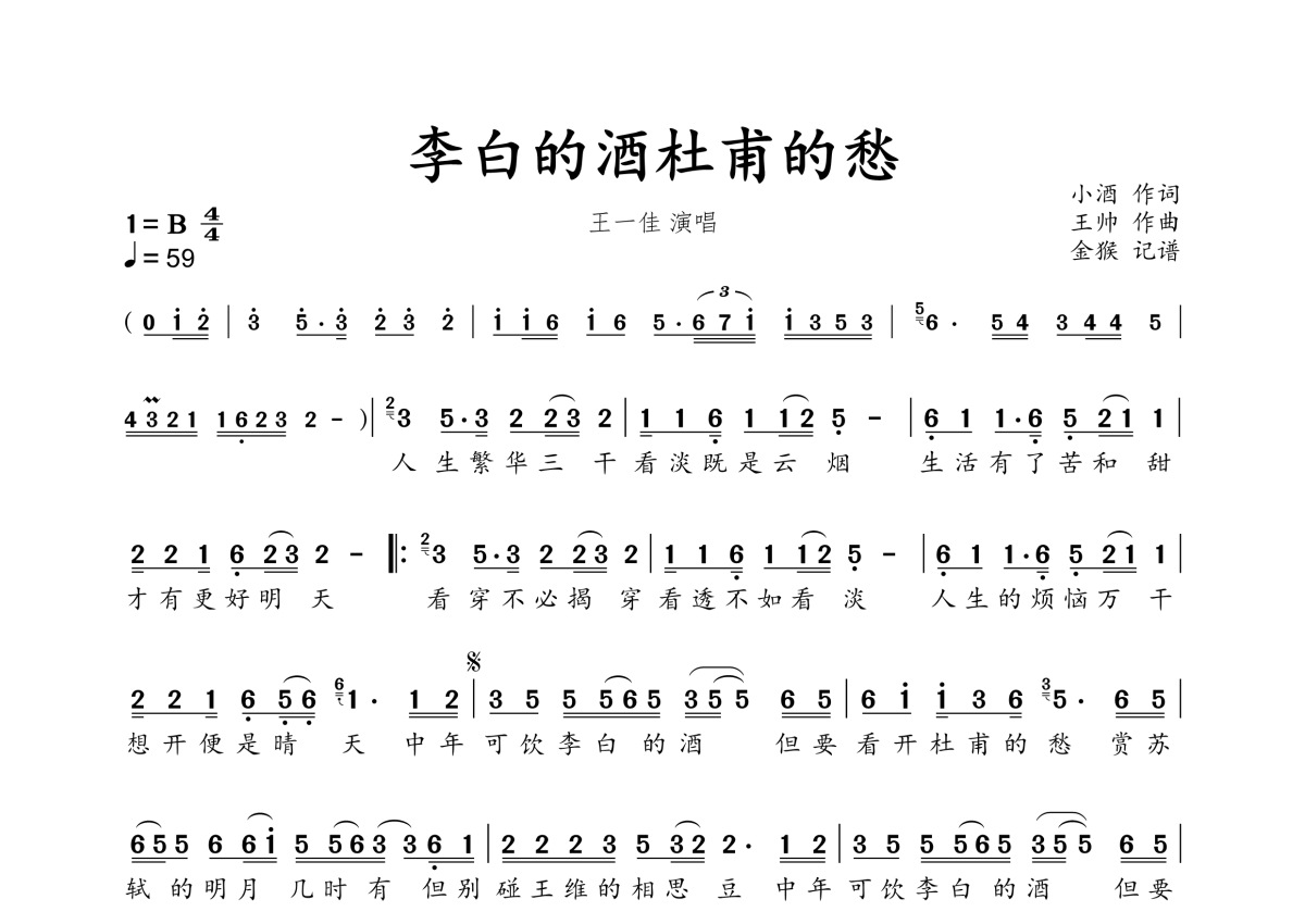 《李白的酒杜甫的愁》是王一佳演唱的一首歌曲,拍号为4/4拍,歌曲速度为每分钟59拍,这份简谱共有一张高清图谱,图谱由 @金猴奋起千钧棒 编配上传。