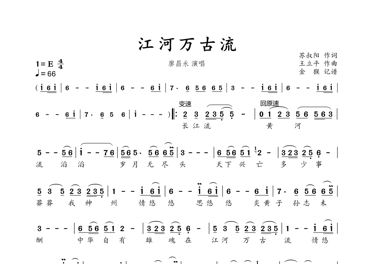 《江河万古流》是廖昌永演唱的一首歌曲,拍号为4/4拍,歌曲速度为每分钟66拍,这份简谱共有一张高清图谱,图谱由 @金猴奋起千钧棒 编配上传。