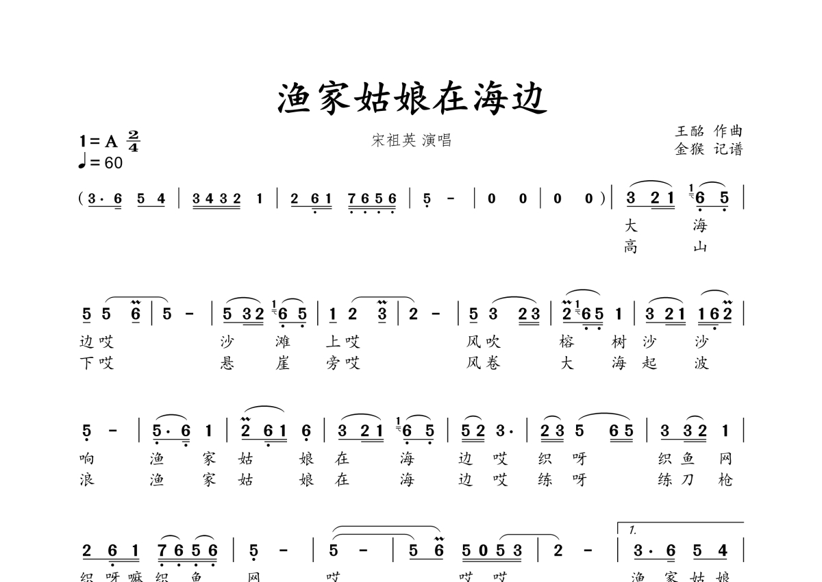 《渔家姑娘在海边》是宋祖英演唱的一首歌曲,拍号为2/4拍,歌曲速度为每分钟60拍,这份简谱共有一张高清图谱,图谱由 @金猴奋起千钧棒 编配上传。