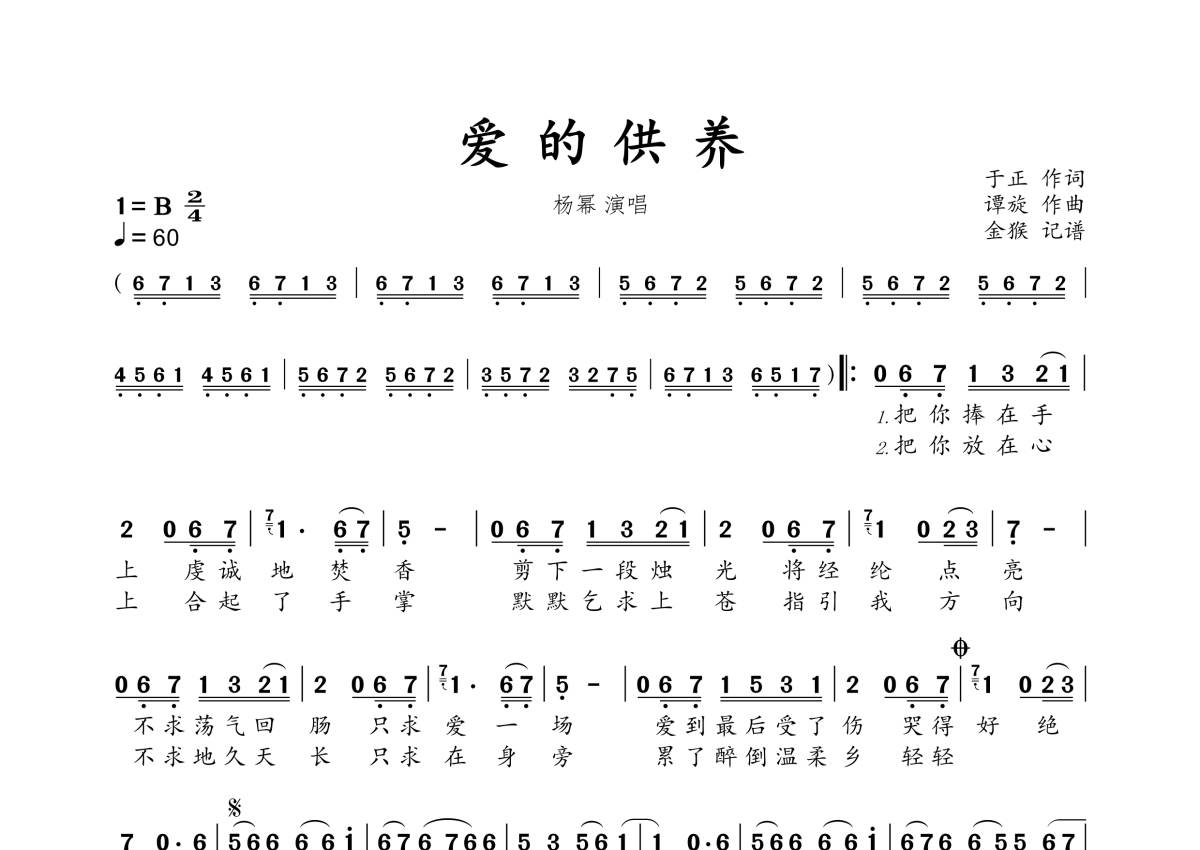 《爱的供养》是杨幂演唱的一首歌曲,拍号为2/4拍,歌曲速度为每分钟60拍,这份简谱共有一张高清图谱,图谱由 @金猴奋起千钧棒 编配上传。