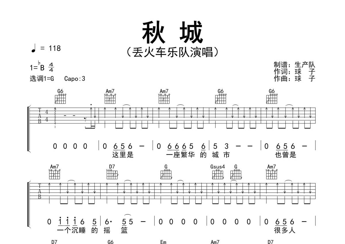 《秋城》是丢火车乐队演唱的一首歌曲,精编完美版,拍号为4/4拍,歌曲速度为每分钟118拍,歌曲原调为Bb调,但由于原调指法比较难,为了方便弹奏,本吉他谱采用的是G调指法编配,变调夹3品弹奏即为原调,当然也可以根据自己的音域改变变调夹位置,或者通过改变和弦调性,以方便自己弹奏,这份吉他谱共有三张高清图谱,图谱由 @生产队 编配上传,图谱使用六线谱编配,包含吉他和弦指法、简谱以及歌词部分,使用这份秋城吉他谱,可以让你更加方便地掌握这首歌曲的弹唱技巧,快来尝试吧。《秋城》是由球子作词、作曲,丢火车乐队演唱的一首歌曲,发行于2017年04月24日。本吉他谱根据原版G调指法编配,包含间奏SOLO编配,精编完美版,值得推荐!。