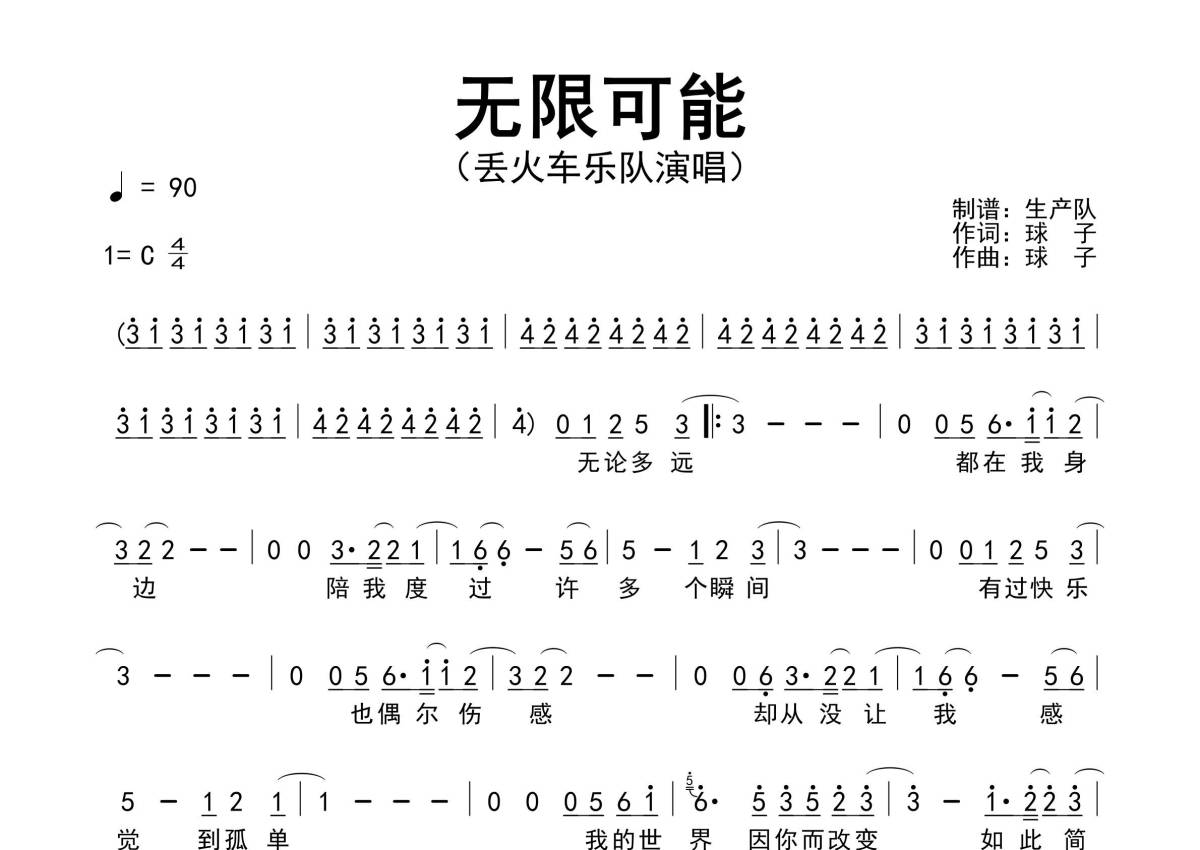 《无限可能》是丢火车乐队演唱的一首歌曲,原版简谱,拍号为4/4拍,歌曲速度为每分钟90拍,这份简谱共有一张高清图谱,图谱由 @生产队 编配上传丢火车乐队演唱的歌曲《无限可能》原版简谱,完整的前奏、间奏和SOLO编配。