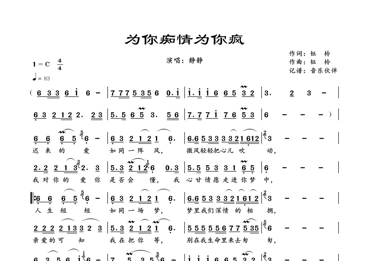 《为你痴情为你疯》是静静演唱的一首歌曲,拍号为4/4拍,歌曲速度为每分钟83拍,这份简谱共有一张高清图谱,图谱由 @音乐伙伴 编配上传。