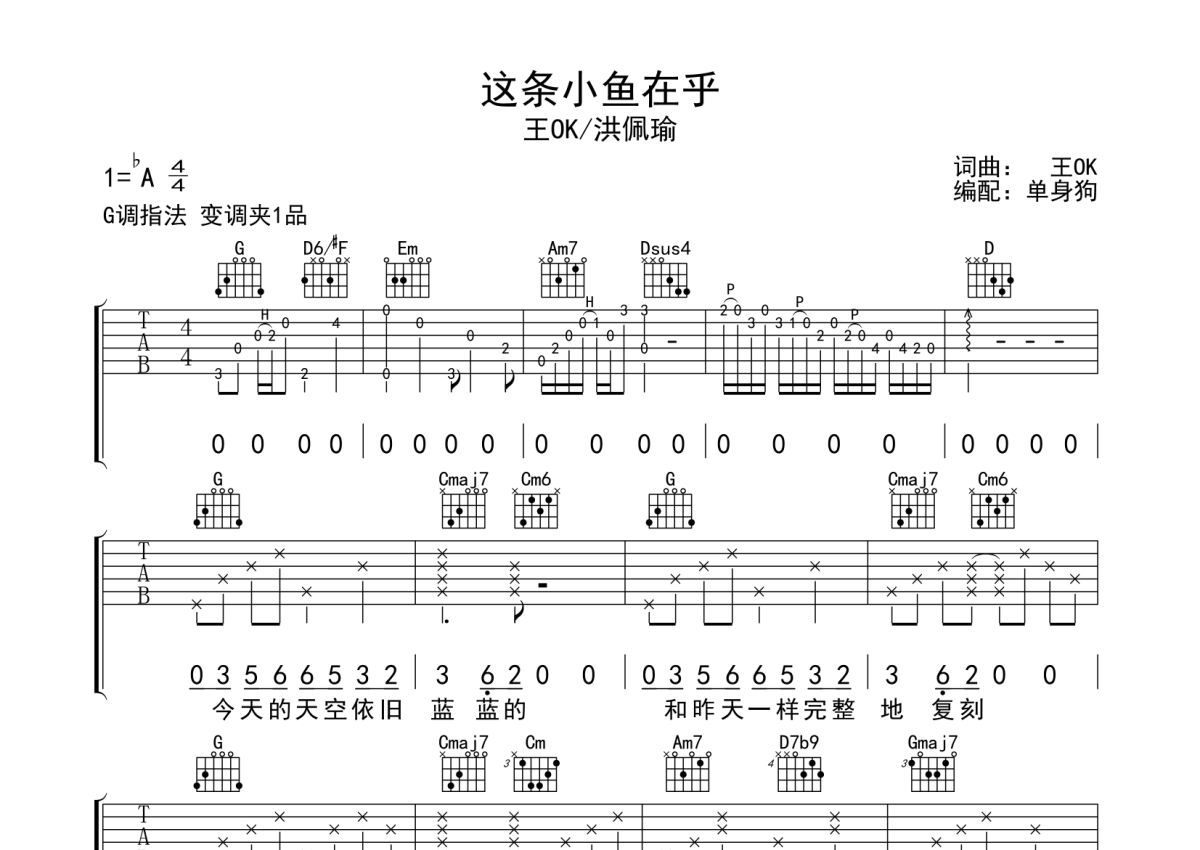 《这条小鱼在乎》是王OK/洪佩瑜演唱的一首歌曲,拍号为4/4拍,歌曲原调为Ab调,但由于原调指法比较难,为了方便弹奏,本吉他谱采用的是G调指法编配,变调夹1品弹奏即为原调,当然也可以根据自己的音域改变变调夹位置,或者通过改变和弦调性,以方便自己弹奏,这份吉他谱共有三张高清图谱,图谱由 @单身狗 编配上传,图谱使用六线谱编配,包含吉他和弦指法、简谱以及歌词部分,使用这份这条小鱼在乎吉他谱,可以让你更加方便地掌握这首歌曲的弹唱技巧,快来尝试吧。