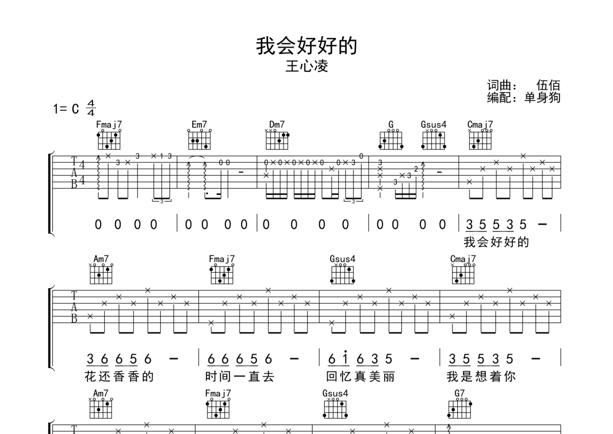 《我会好好的》是王心凌演唱的一首歌曲,拍号为4/4拍,歌曲原调为C调,本吉他谱采用的是C调指法编配,演奏时不需要使用变调夹即为原调,这份吉他谱共有三张高清图谱,图谱由 @单身狗 编配上传,图谱使用六线谱编配,包含吉他和弦指法、简谱以及歌词部分,使用这份我会好好的吉他谱,可以让你更加方便地掌握这首歌曲的弹唱技巧,快来尝试吧。