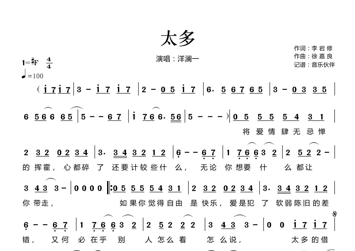 《太多》是洋澜一演唱的一首歌曲,这份简谱共有一张高清图谱,图谱由 @音乐伙伴 编配上传。