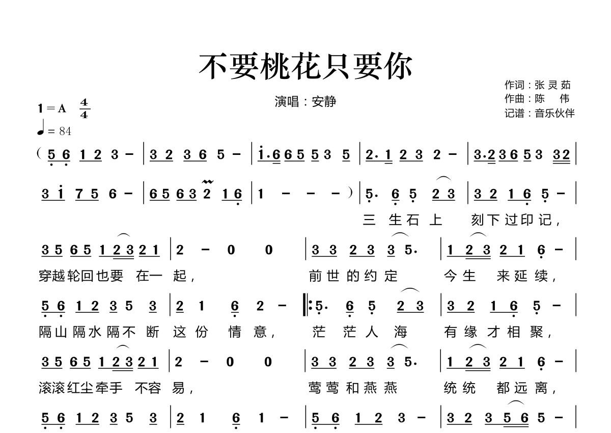 《不要桃花只要你》是安静演唱的一首歌曲,这份简谱共有一张高清图谱,图谱由 @音乐伙伴 编配上传。