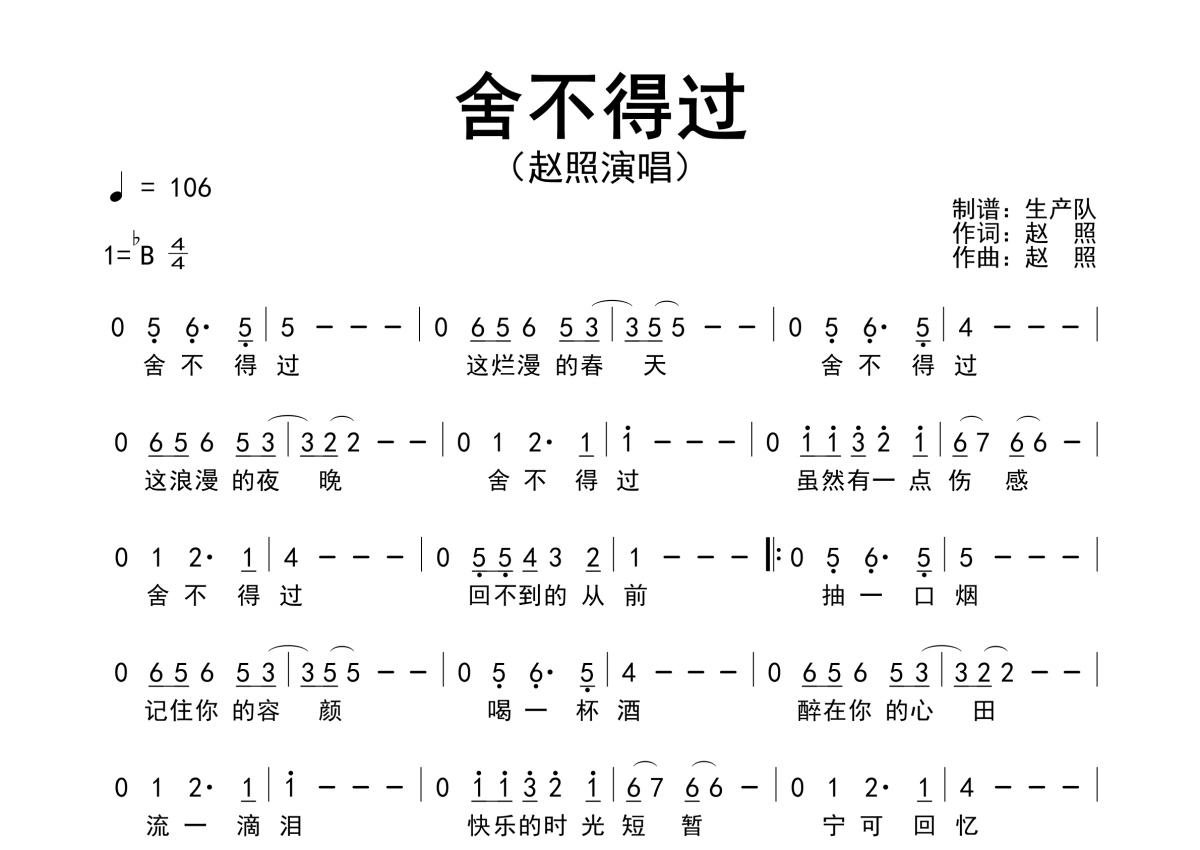 《舍不得过》是赵照演唱的一首歌曲,原版简谱,拍号为4/4拍,歌曲速度为每分钟106拍,这份简谱共有一张高清图谱,图谱由 @生产队 编配上传赵照演唱的歌曲《舍不得过》原版简谱。