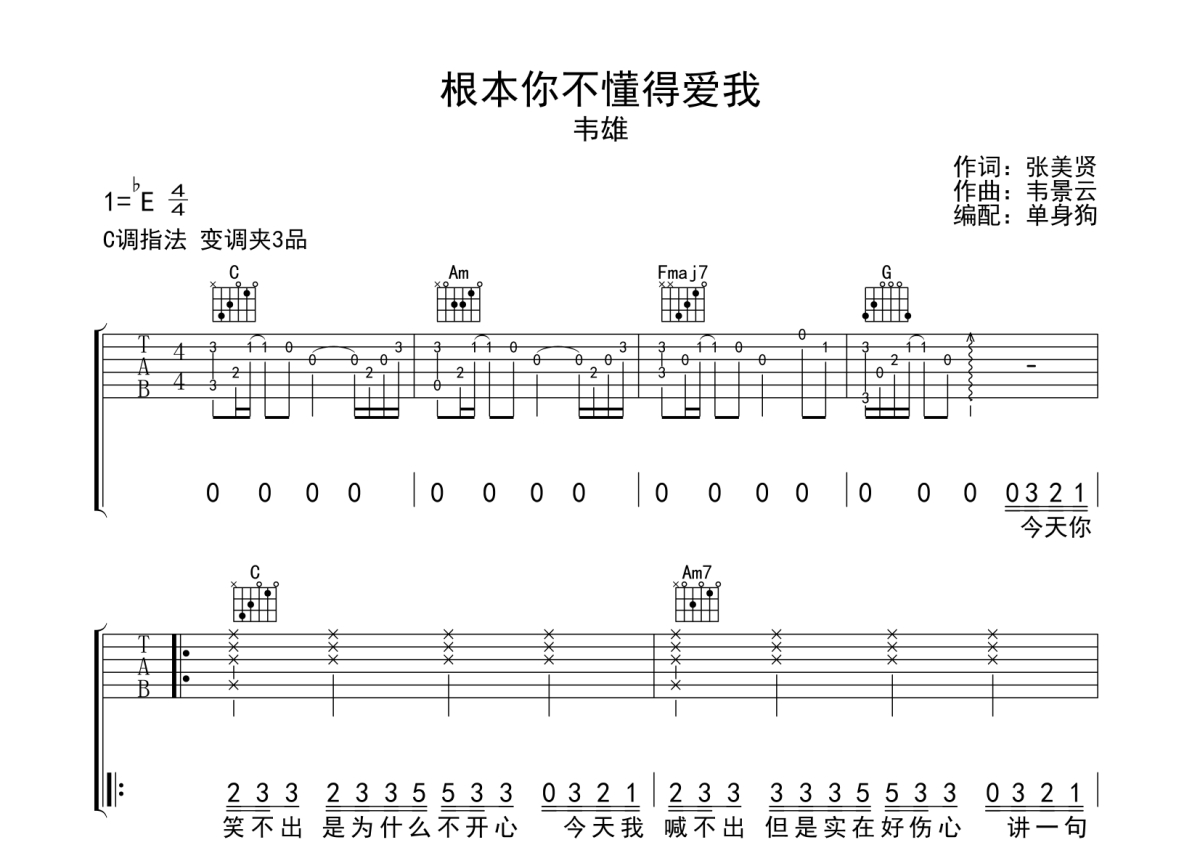根本你不懂得爱我吉他谱 - 韦雄 - C调弹唱六线谱