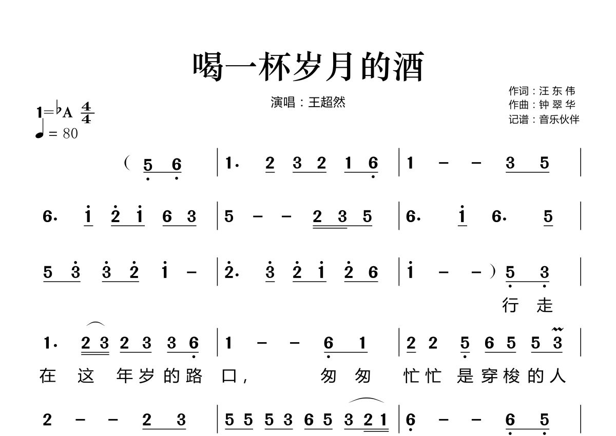 喝一杯岁月的酒简谱 - 王超然演唱