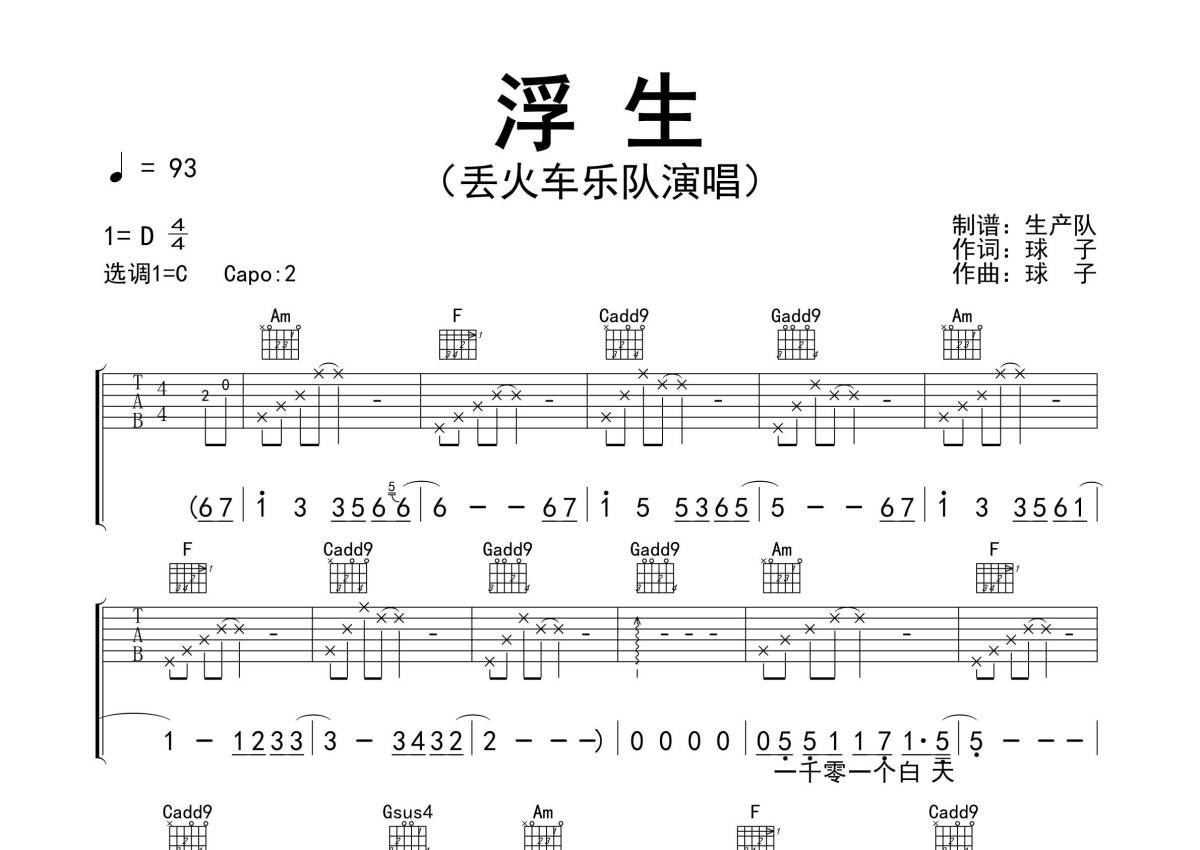 《浮生》是丢火车乐队演唱的一首歌曲,精编完美版,拍号为4/4拍,歌曲速度为每分钟93拍,歌曲原调为D调,但由于原调指法比较难,为了方便弹奏,本吉他谱采用的是C调指法编配,变调夹2品弹奏即为原调,当然也可以根据自己的音域改变变调夹位置,或者通过改变和弦调性,以方便自己弹奏,这份吉他谱共有三张高清图谱,图谱由 @生产队 编配上传,图谱使用六线谱编配,包含吉他和弦指法、简谱以及歌词部分,使用这份浮生吉他谱,可以让你更加方便地掌握这首歌曲的弹唱技巧,快来尝试吧。《浮生》是由丢火车乐队作词、作曲并演唱的歌曲,该歌曲收录于丢火车乐队2018年发行的专辑《浮生》中。本吉他谱根据原版C调指法编配,完整的前奏、间奏编配,精编完美版,值得推荐!。