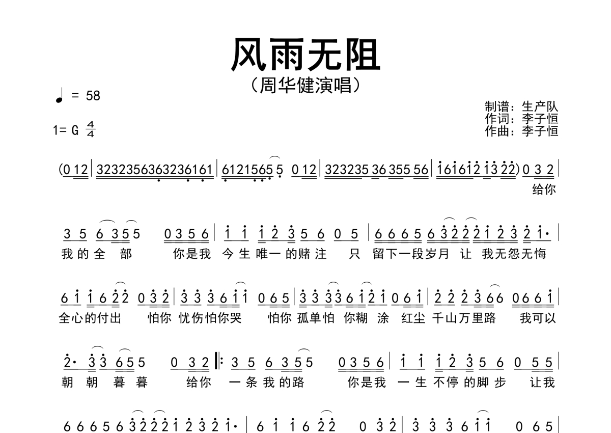《风雨无阻》是周华健演唱的一首歌曲,原版简谱,拍号为4/4拍,歌曲速度为每分钟58拍,这份简谱共有一张高清图谱,图谱由 @生产队 编配上传周华健演唱的经典歌曲《风雨无阻》原版简谱。